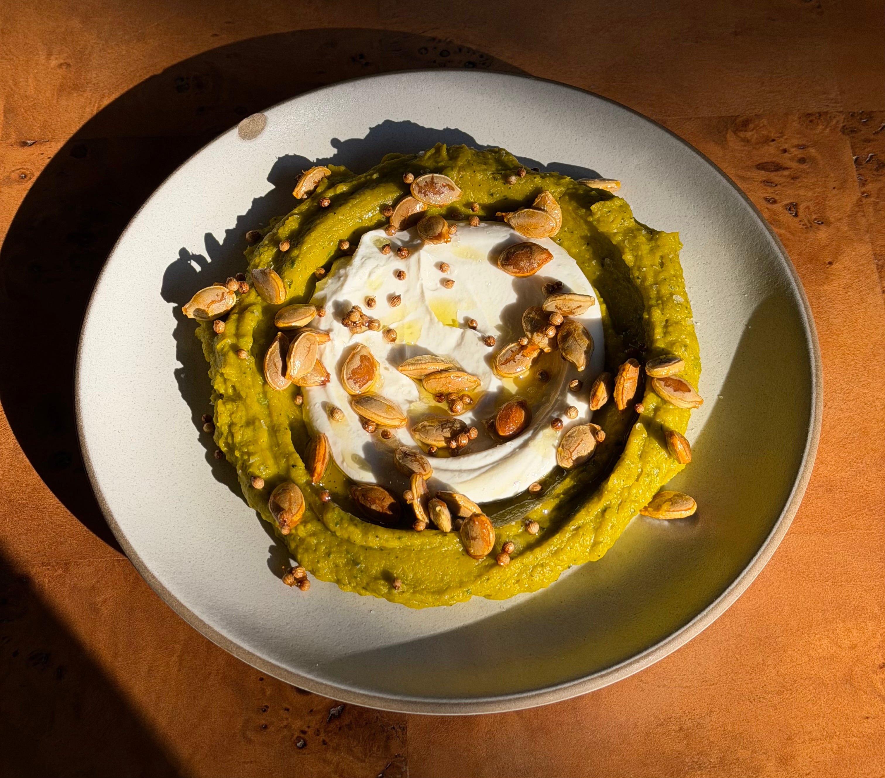To plate, spread a generous scoop of the kabocha purée onto a plate or shallow bowl and smooth it into a circle with a slight divot in the center. Spoon the tahini yogurt into the middle and swirl to create layers. Finish with a drizzle of olive oil, pinch of maldon, and a handful of the toasted pumpkin and coriander seeds.