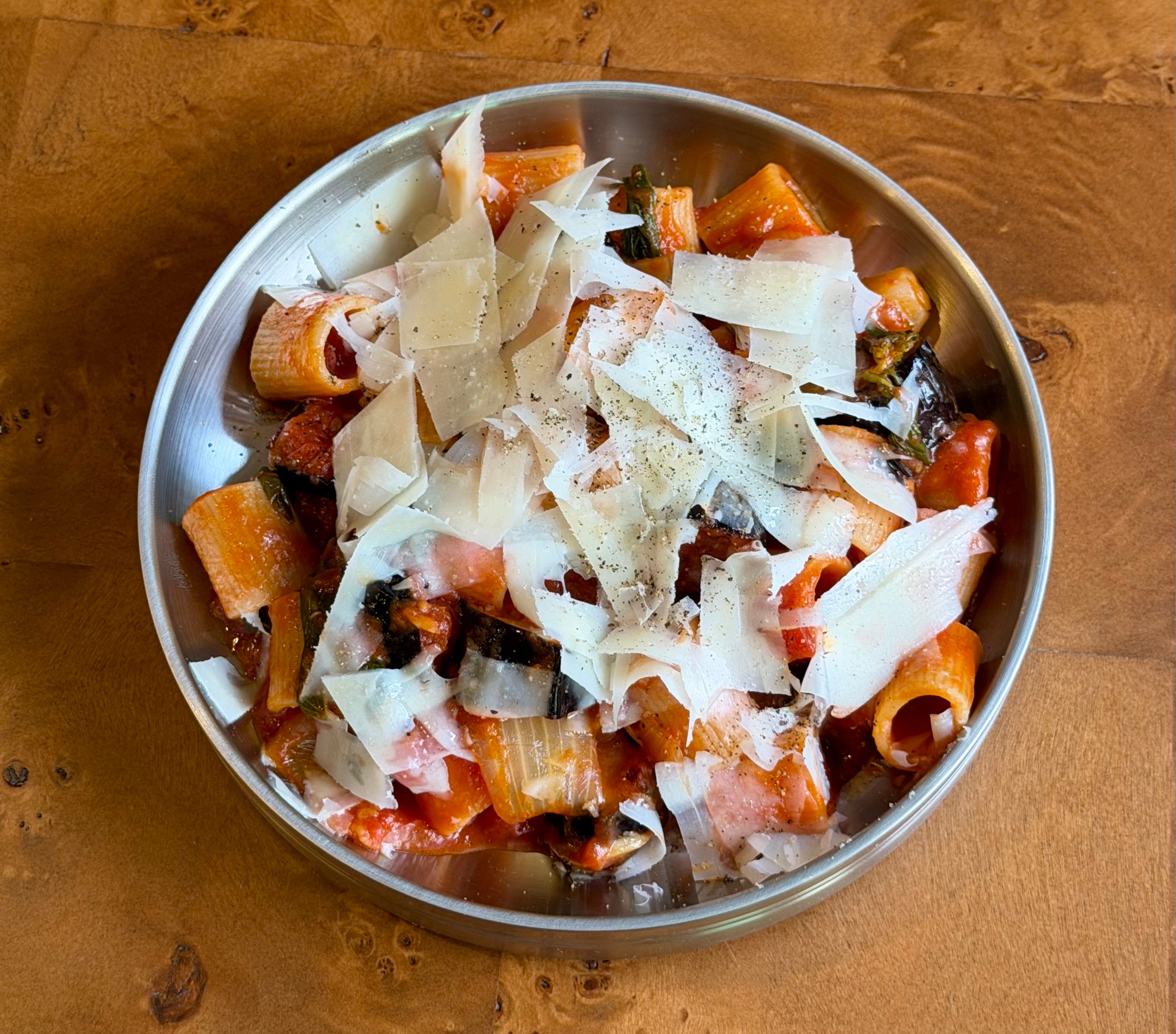 Finally, add the eggplant back into the pan and mix gently to coat, being careful not to break the pieces. To plate, spoon the pasta onto a plate or bowl and finish with generous shavings of cheese — I like using a peeler for wide, thin strips — and a good crack of black pepper.
